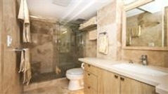Travertine Floor to ceiling tile through out , glass bypass shower doors.